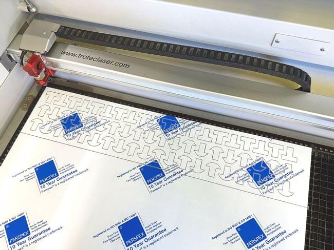 Cortadora láser Trotec CO₂ procesando lámina acrílica Perspex con recortes en forma de flecha